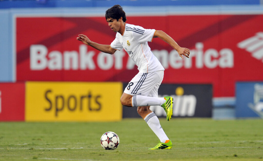 August 3, 2013; Los Angeles, CA, USA; Real Madrid midfielder Kaka (8) moves the ball against Everton during the second half of the International Champions Cup at Dodger Stadium. Mandatory Credit: Gary A. Vasquez-USA TODAY Sports