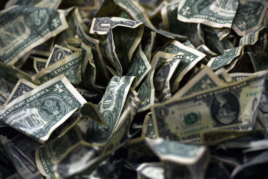 A pile of dollar bills sits on a table on Saturday, December 11, 2021.