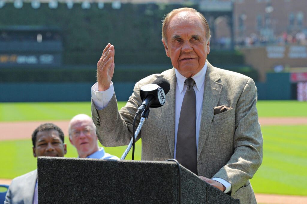 Aug 20, 2017; Detroit, MI, USA; Sportscaster Dick Enberg is honored with the lifetime achievement award prior to a game with the Los Angeles Dodgers and the Detroit Tigers at Comerica Park. Mandatory Credit: Patrick Gorski-USA TODAY Sports