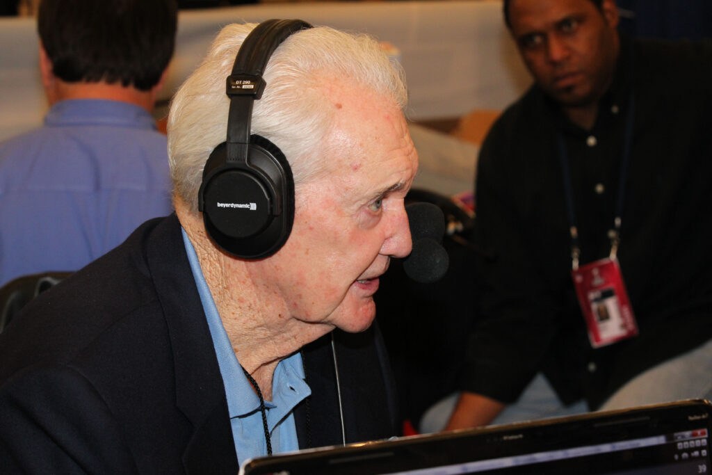 Feb 1, 2012; Indianapolis, IN, USA; Pat Summerall gives interviews on Radio row prior to Super Bowl XLVI at Lucas Oil Stadium. Mandatory Credit: Matthew Emmons-USA TODAY Sports