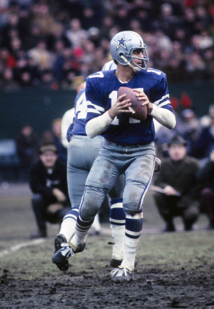 Dec 21, 1968; Cleveland, OH, USA; FILE PHOTO; Dallas Cowboys quarterback Don Meredith (17) prepares to throw against the Cleveland Browns during the 1968 NFL Divisional Playoff Game at Cleveland Municipal Stadium. The Browns defeated the Cowboys 31-20. Mandatory Credit: Malcolm Emmons-USA TODAY Sports