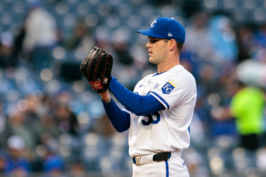 Mar 27, 2025; Kansas City, Missouri, USA; Kansas City Royals starting pitcher Cole Ragans (55) pitches during the first inning against the Cleveland Guardians at Kauffman Stadium. Mandatory Credit: Jay Biggerstaff-Imagn Images