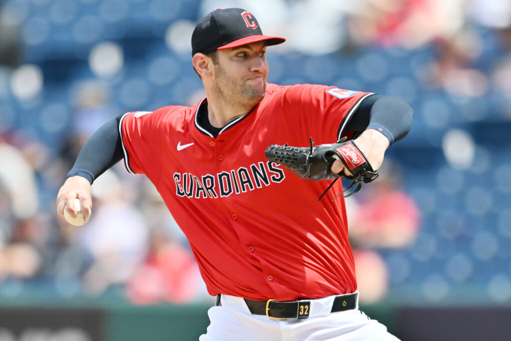 May 14, 2025; Cleveland, Ohio, USA; Cleveland Guardians starting pitcher Gavin Williams (32) throws a pitch during the first inning against the Milwaukee Brewers at Progressive Field. Mandatory Credit: Ken Blaze-Imagn Images