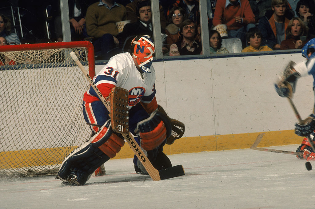 Canadian professional ice hockey player Billy Smith #31 of the New York Islanders defends the goal during a home game, Nassau Coliseum, Uniondale, New York, 1970s. Smith played for the Islanders from 1972 to 1989. (Photo by Bruce Bennett Studios via Getty Images Studios/Getty Images)