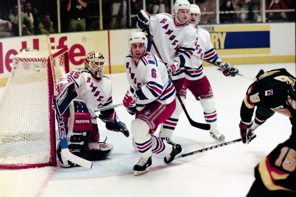 Rangers goalie Mike Richter and defenders protect the goal against Vancouver during game 7 of the Stanley Cup finals at Madison Square Garden June 14, 1994. The Rangers won the game 3-2 and the Stanley Cup.