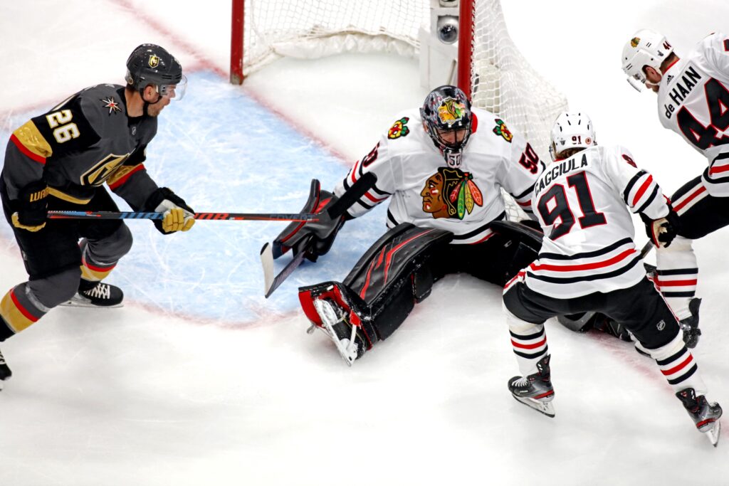 Aug 18, 2020; Edmonton, Alberta, CAN; Chicago Blackhawks goaltender Corey Crawford (50) makes a save against Vegas Golden Knights center Paul Stastny (26) during the first period in game five of the first round of the 2020 Stanley Cup Playoffs at Rogers Place. Mandatory Credit: Gerry Thomas-USA TODAY Sports