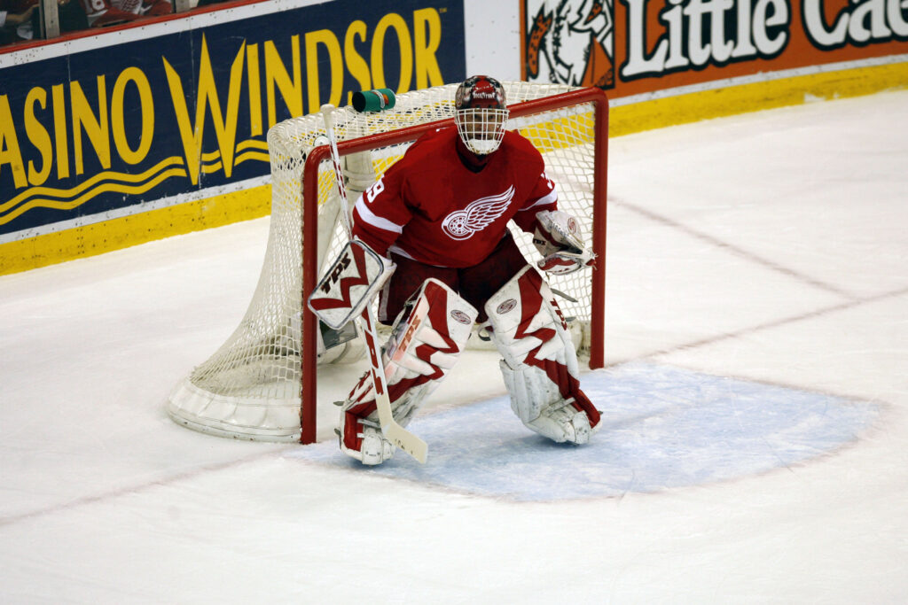 Apr 26, 2007; Detroit, MI, USA; Detroit Red Wing goaltender Dominik Hasek during the first period of game one of the 2007 NHL Western Conference semi-finals at Joe Louis Arena in Detroit. The San Jose Sharks defeated the Red Wings 2-0. Mandatory Credit: Leon Halip-USA TODAY Sports