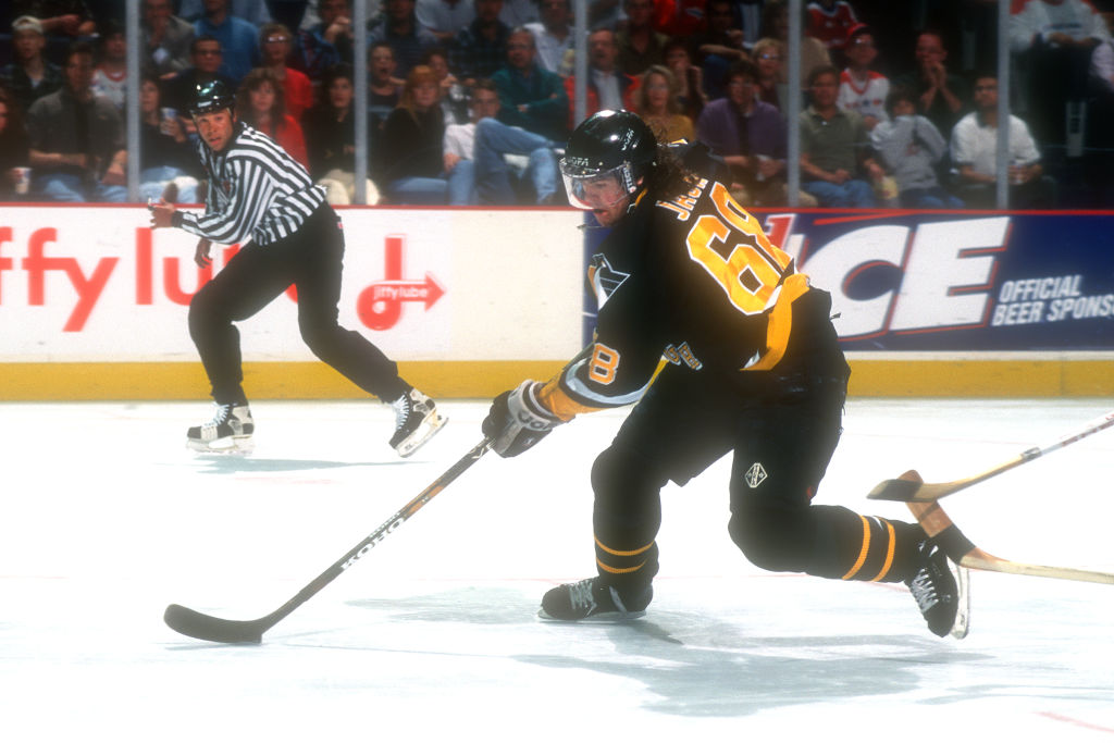 LANDOVER, MD – JANUARY 01: Jaromir Jagr #66 of the Pittsburgh Penguins skates with the puck during a NHL hockey game against the Washington Capitals on January 1, 1996 at USAir Arena in Landover, Maryland. (Photo by Mitchell Layton/Getty Images)