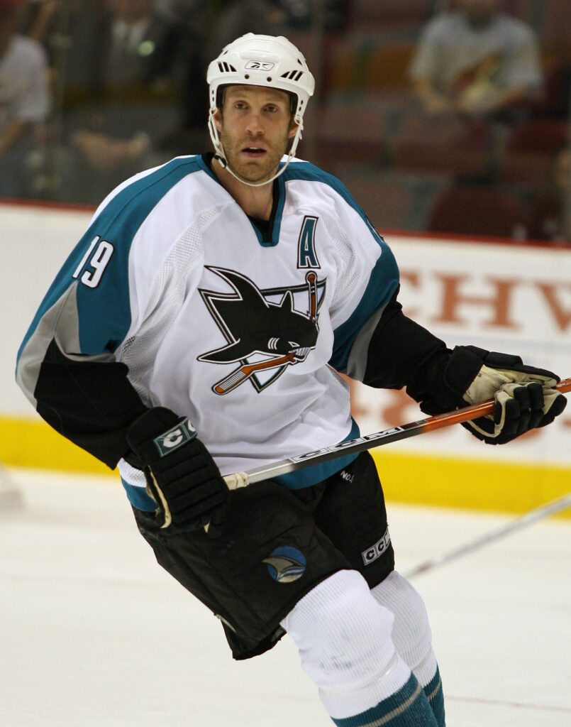 Apr 10, 2006; Glendale, AZ, USA; San Jose Sharks center (19) Joe Thornton against the Phoenix Coyotes at Glendale Arena. Mandatory Credit: Rick Scuteri-USA TODAY Sports Copyright Rick Scuteri