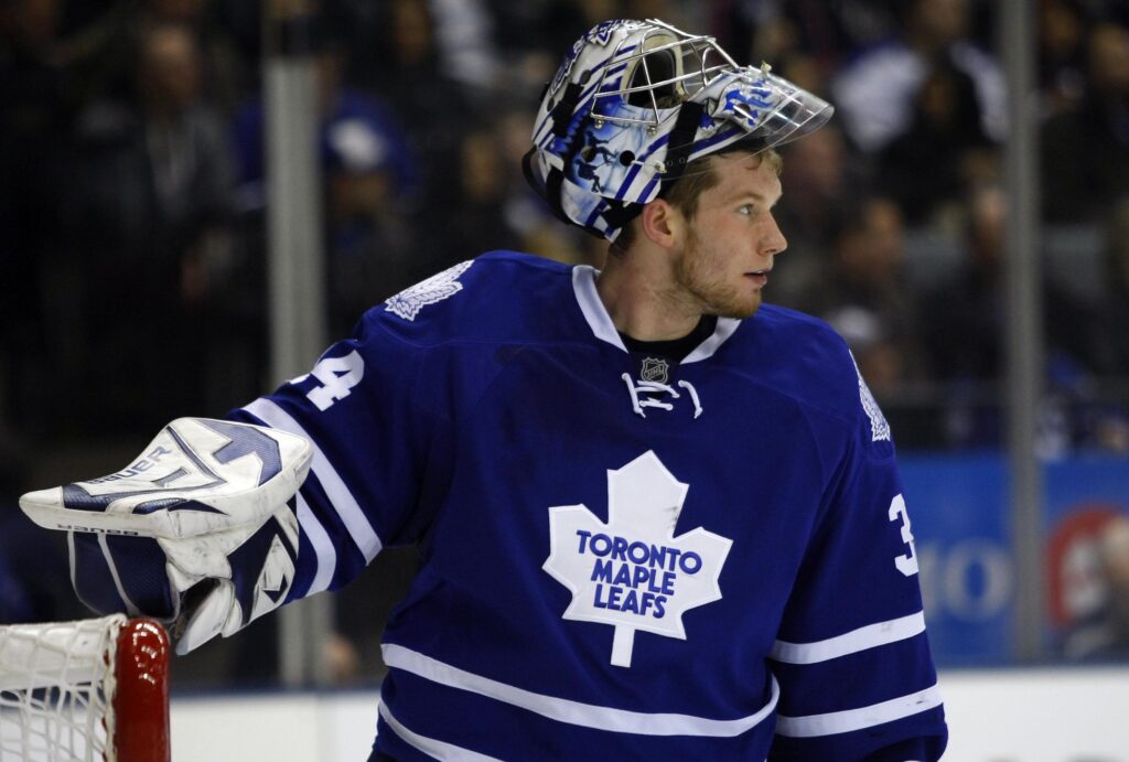 January 3, 2011; Toronto, ON, CANADA; Toronto Maple Leafs goalie James Reimer (34) during a break in the action against the Boston Bruins at the Air Canada Centre. Boston defeated Toronto 2-1. Mandatory Credit: John E. Sokolowski-USA TODAY Sports