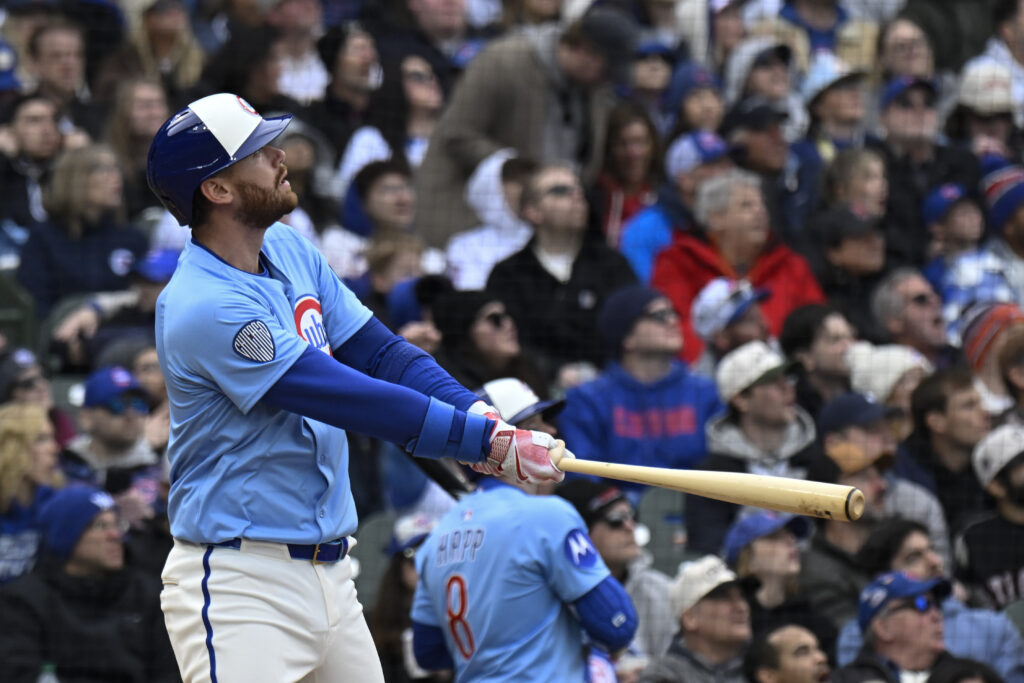 Apr 5, 2025; Chicago, Illinois, USA; Chicago Cubs catcher Carson Kelly (15) hits a three run home run against the San Diego Padres during the sixth inning at Wrigley Field. Mandatory Credit: Matt Marton-Imagn Images