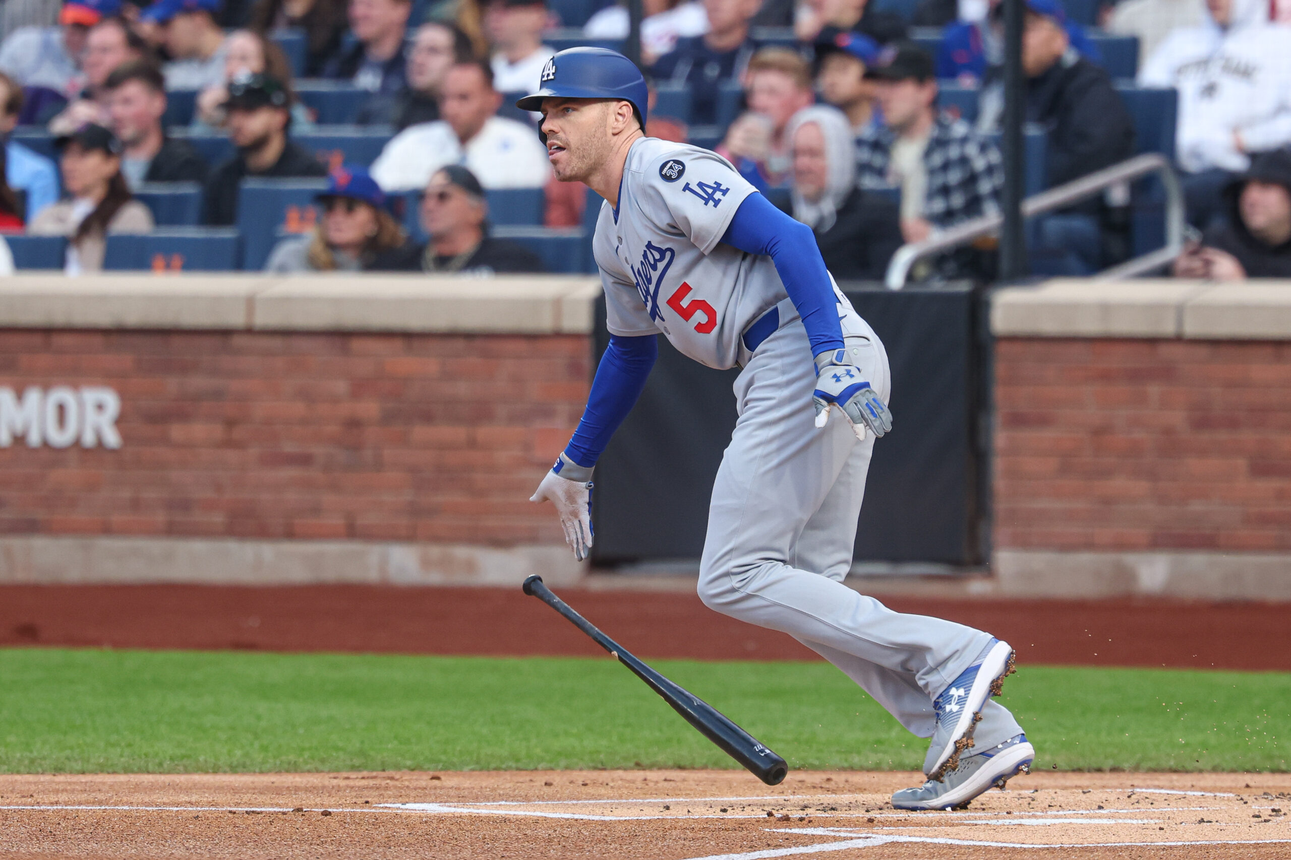 May 25, 2025; New York City, New York, USA; Los Angeles Dodgers first baseman Freddie Freeman (5) doubles during the first inning against the New York Mets at Citi Field. Mandatory Credit: Vincent Carchietta-Imagn Images