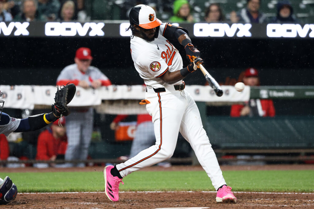 May 27, 2025; Baltimore, Maryland, USA; Baltimore Orioles shortstop Jorge Mateo (3) hits a single during the sixth inning against the St. Louis Cardinals at Oriole Park at Camden Yards. Mandatory Credit: Daniel Kucin Jr.-Imagn Images