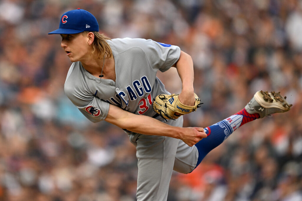 Jun 6, 2025; Detroit, Michigan, USA; Chicago Cubs starting pitcher Ben Brown (32) throws a pitch against the Detroit Tigers in the third inning at Comerica Park. Mandatory Credit: Lon Horwedel-Imagn Images