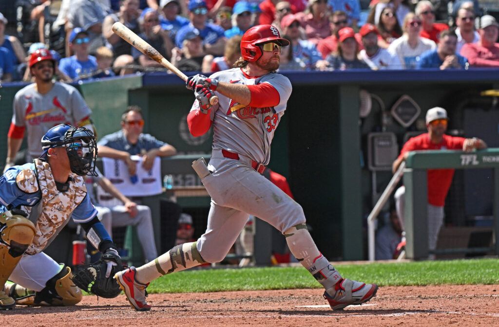 May 18, 2025; Kansas City, Missouri, USA; St. Louis Cardinals second baseman Brendan Donovan (33) doubles in the ninth inning against the Kansas City Royals at Kauffman Stadium. Mandatory Credit: Peter Aiken-Imagn Images