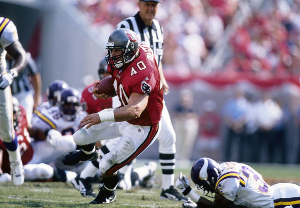 Nov 1, 1998; Tampa, FL, USA; Tampa Bay Buccaneers running back Mike Alstott (40) carries the ball against the Minnesota Vikings at Raymond James Stadium. FILE PHOTO; Mandatory Credit: USA TODAY Sports