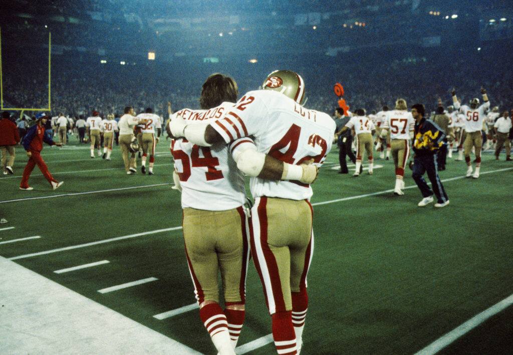 Jan 24, 1982; Pontiac, MI, USA; FILE PHOTO; San Francisco 49ers players Ronnie Lott (42) and Jack Reynolds (64) embrace after defeating the Cincinnati Bengals 26-21 to win Super Bowl XVI at the Pontiac Superdome. Mandatory Credit: Manny Rubio-USA TODAY Sports