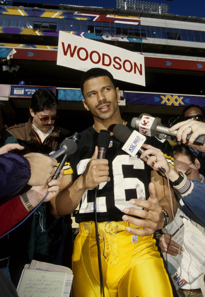 Jan 23, 1996; Tempe, AZ, USA; FILE PHOTO; Pittsburgh Steelers defensive back Rod Woodson addresses the media as he is interviewed at media day prior to Super Bowl XXX. Mandatory Credit: USA TODAY Sports