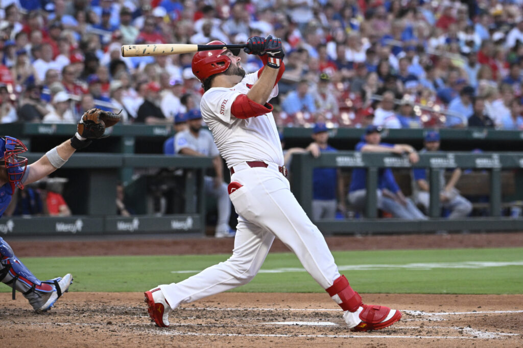 Jun 23, 2025; St. Louis, Missouri, USA; St. Louis Cardinals right fielder Alec Burleson (41) hits a two-run home run against the Chicago Cubs in the fifth inning at Busch Stadium. Mandatory Credit: Joe Puetz-Imagn Images