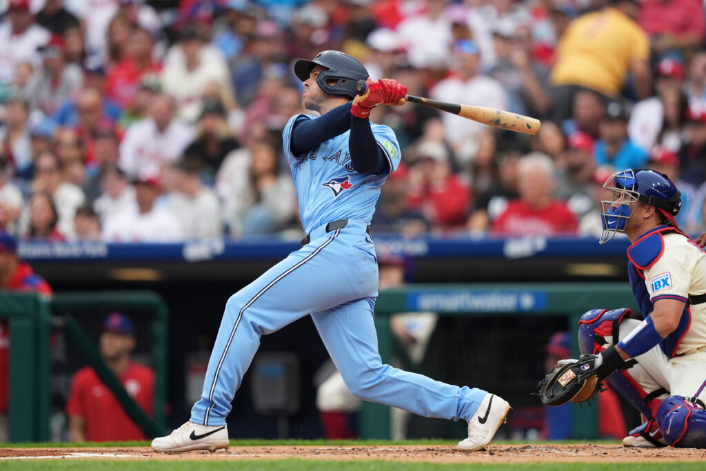Jun 14, 2025; Philadelphia, Pennsylvania, USA; Toronto Blue Jays infielder Ernie Clement (22) hits a double against the Philadelphia Phillies in the second inning at Citizens Bank Park. Mandatory Credit: Kyle Ross-Imagn Images