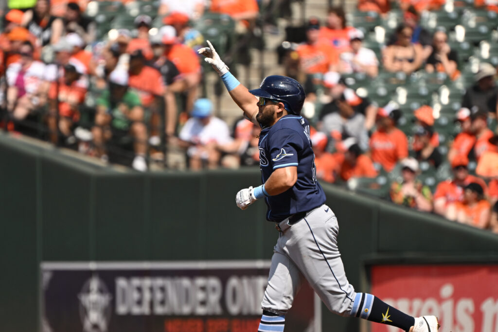 Jun 28, 2025; Baltimore, Maryland, USA; Tampa Bay Rays first baseman Jonathan Aranda (62) celebrates on the base path after hitting a home run against the Baltimore Orioles during the first inning at Oriole Park at Camden Yards. Mandatory Credit: Rafael Suanes-Imagn Images