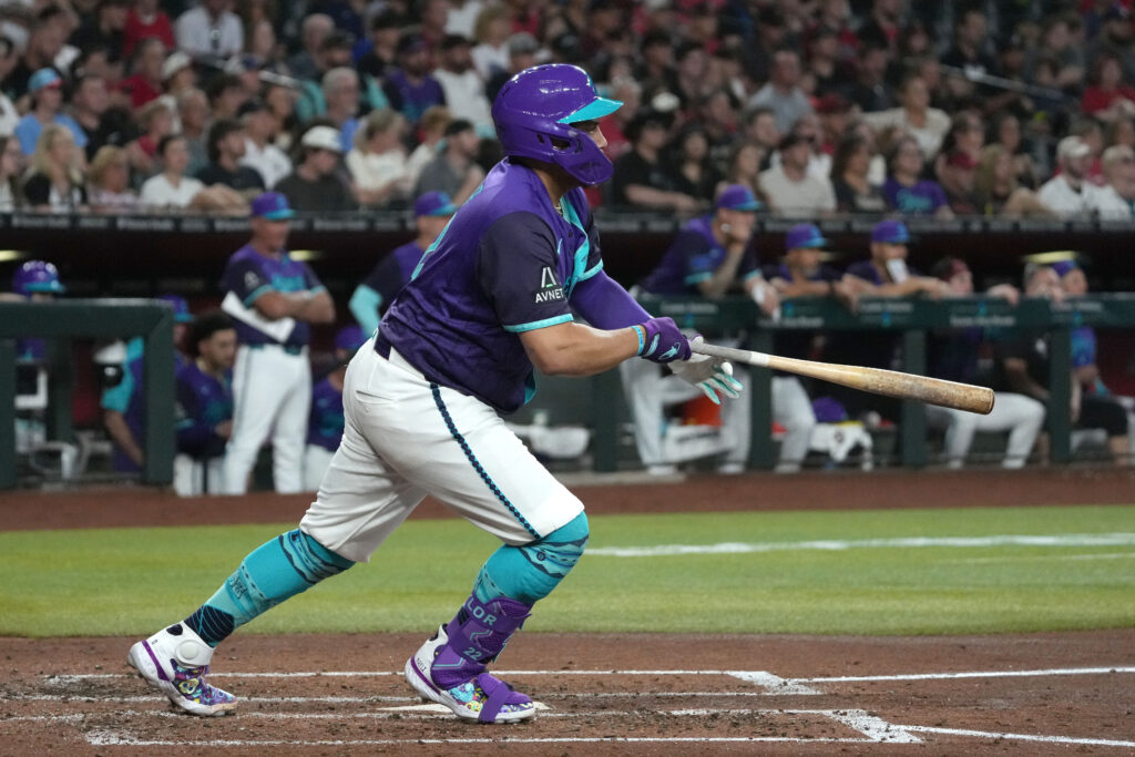 Jul 5, 2025; Phoenix, Arizona, USA; Arizona Diamondbacks first baseman Josh Naylor (22) hits an RBI single against the Kansas City Royals in the third inning at Chase Field. Mandatory Credit: Rick Scuteri-Imagn Images