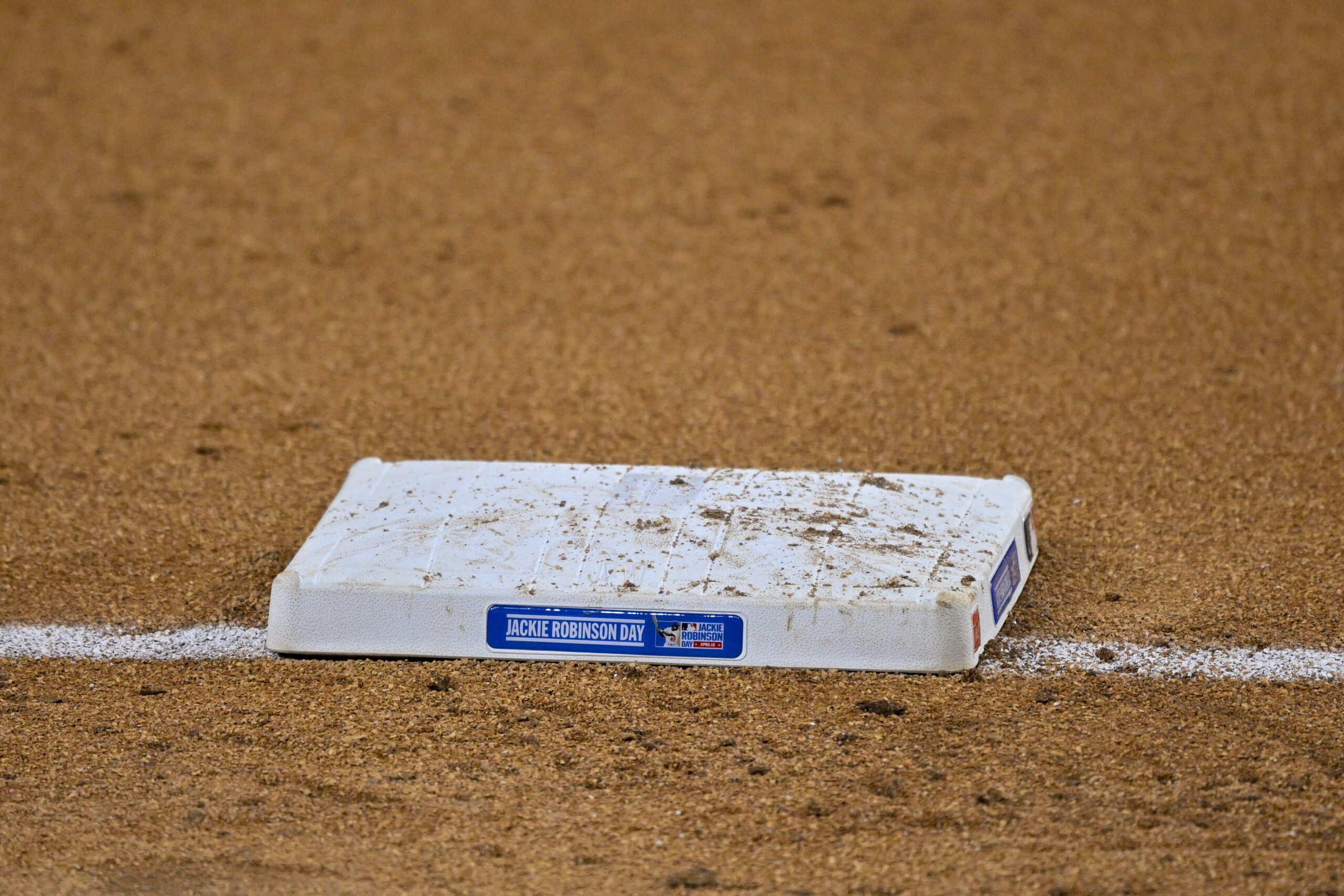 Apr 15, 2025; Arlington, Texas, USA; A view of the third base with logo during the fifth inning of the game between the Texas Rangers and the Los Angeles Angels at Globe Life Field. All MLB players will be wearing the number 42 on Jackie Robinson Day to commemorate Robinson making his major league debut in 1947. Mandatory Credit: Jerome Miron-Imagn Images