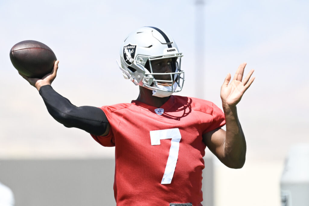 Jun 11, 2025; Henderson, NV, USA; Las Vegas Raiders quarterback Geno Smith (7) throws the ball during Las Vegas Raiders Minicamp at Intermountain Health Performance Center. Mandatory Credit: Candice Ward-Imagn Images