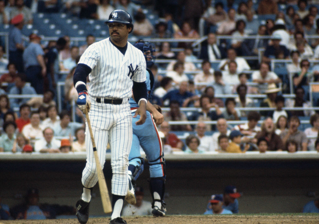 The New York Yankees’ Reggie Jackson batting during a game against the Texas Rangers, New York, May 25th 1977. (Photo by UPI/Bettmann Archive/Getty Images)