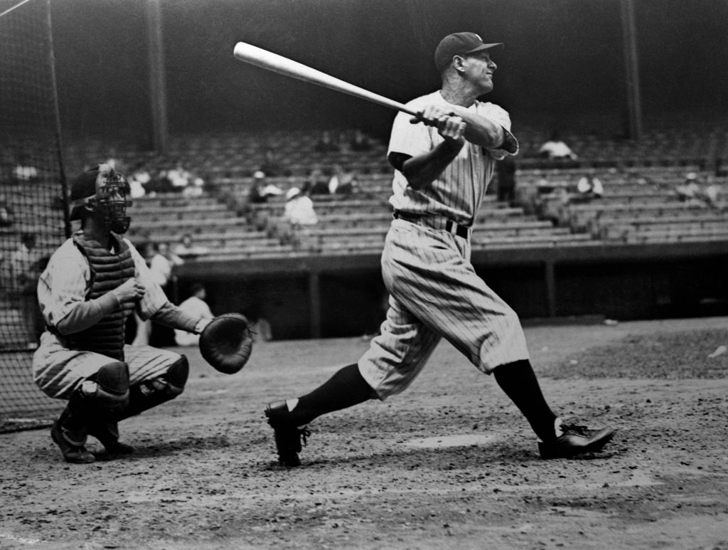 1925: Lou Gehrig, first basemen for the New York Yankees, hitting the ball during warm p before a game, circa 1925. (Photo by The Stanley Weston Archive/Getty Images)