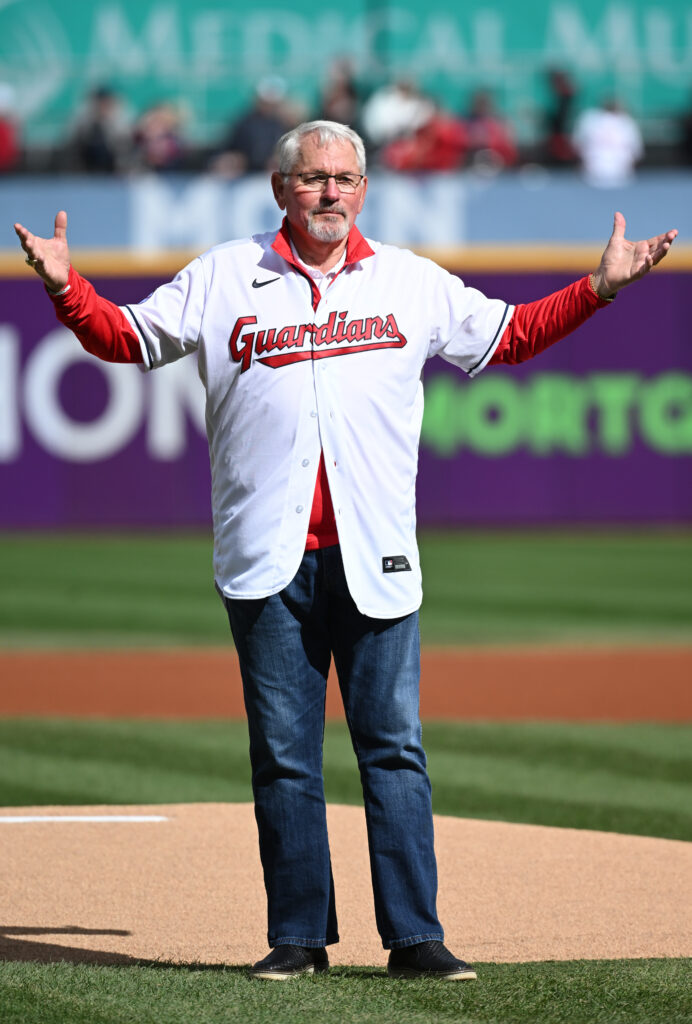 Oct 8, 2022; Cleveland, Ohio, USA; Former Cleveland manager Mike Hargrove throws out the first pitch before the start of game two of the Wild Card series for the 2022 MLB Playoffs against the Cleveland Guardians and Tampa Bay Rays at Progressive Field. Mandatory Credit: Ken Blaze-USA TODAY Sports