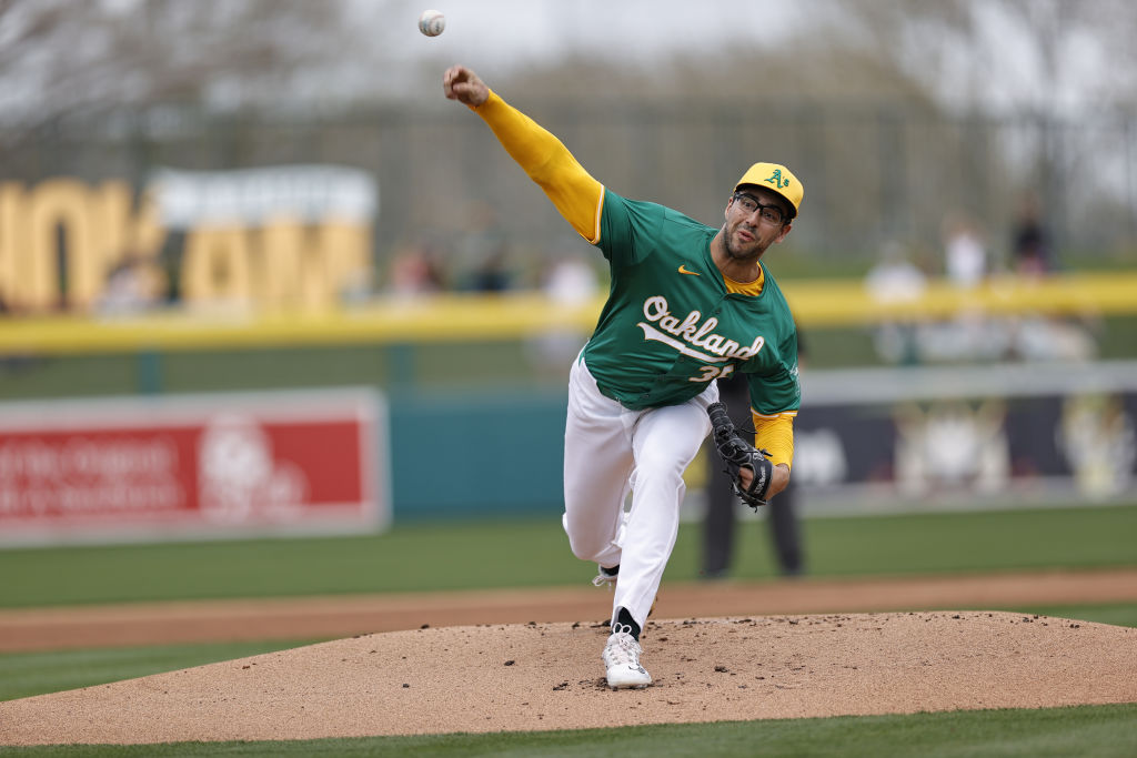 MESA, AZ - FEBRUARY 24: Joe Boyle #35 of the Oakland Athletics pitches during a spring training game against the Colorado Rockies at HoHoKam Stadium on February 24, 2024 in Mesa, Arizona. (Photo by Michael Zagaris/Oakland Athletics/Getty Images)
