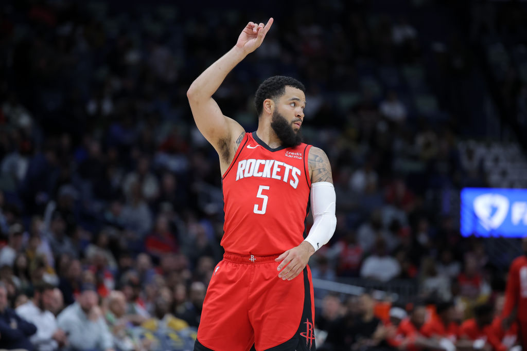 NEW ORLEANS, LOUISIANA - FEBRUARY 22: Fred VanVleet #5 of the Houston Rockets reacts against the New Orleans Pelicans during a game at the Smoothie King Center on February 22, 2024 in New Orleans, Louisiana. NOTE TO USER: User expressly acknowledges and agrees that, by downloading and or using this Photograph, user is consenting to the terms and conditions of the Getty Images License Agreement. (Photo by Jonathan Bachman/Getty Images)