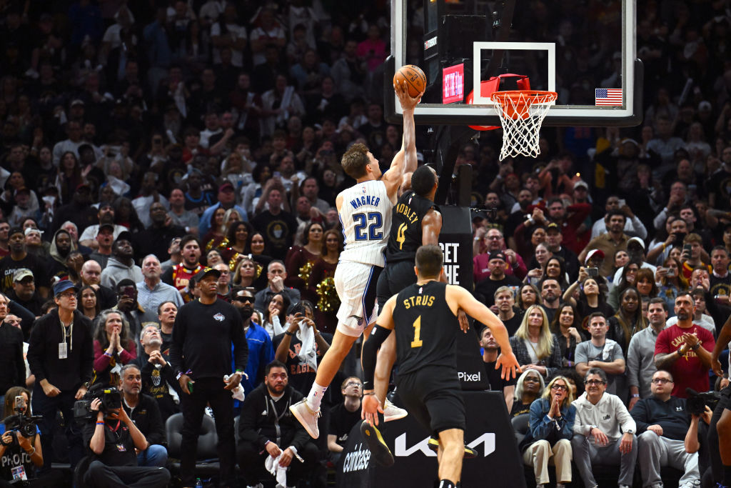 CLEVELAND, OHIO - APRIL 30: Evan Mobley #4 of the Cleveland Cavaliers blocks Franz Wagner #22 of the Orlando Magic during the fourth quarter of game five of the Eastern Conference First Round Playoffs at Rocket Mortgage Fieldhouse on April 30, 2024 in Cleveland, Ohio. The Cavaliers defeated the Magic 104-103. NOTE TO USER: User expressly acknowledges and agrees that, by downloading and or using this photograph, User is consenting to the terms and conditions of the Getty Images License Agreement. (Photo by Jason Miller/Getty Images)