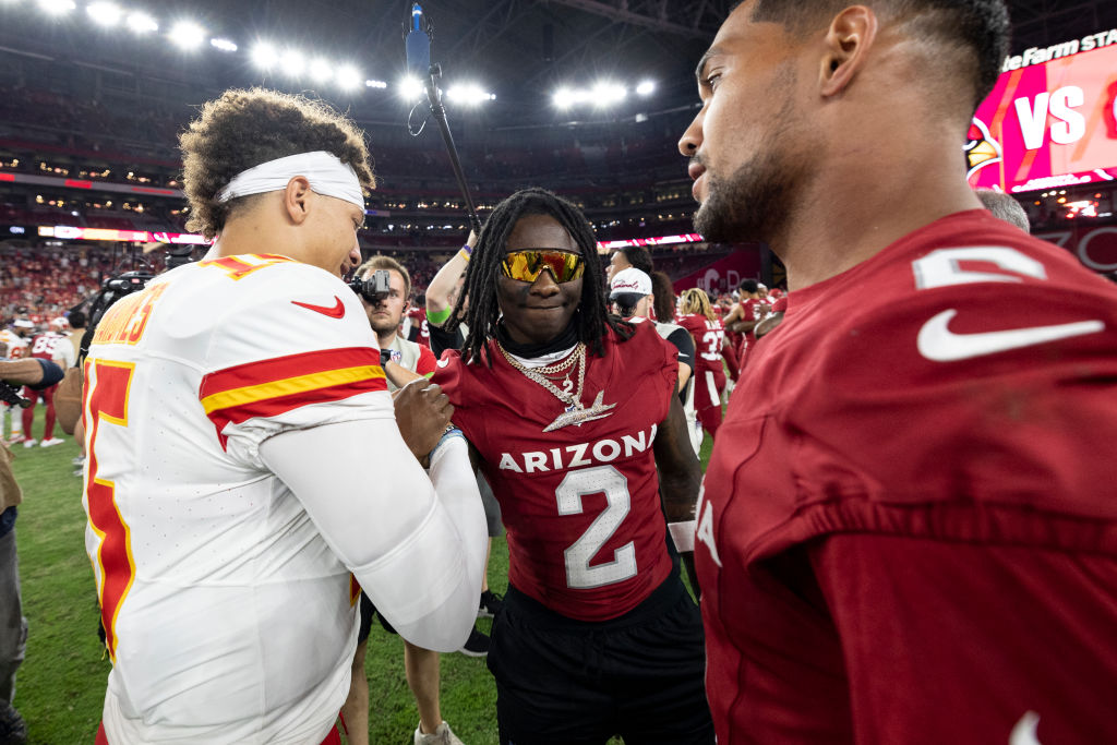 GLENDALE, ARIZONA - AUGUST 19: Patrick Mahomes #15 of the Kansas City Chiefs meets with Marquise Brown #2 of the Arizona Cardinals following an NFL preseason football game at State Farm Stadium on August 19, 2023 in Glendale, Arizona. (Photo by Michael Owens/Getty Images)