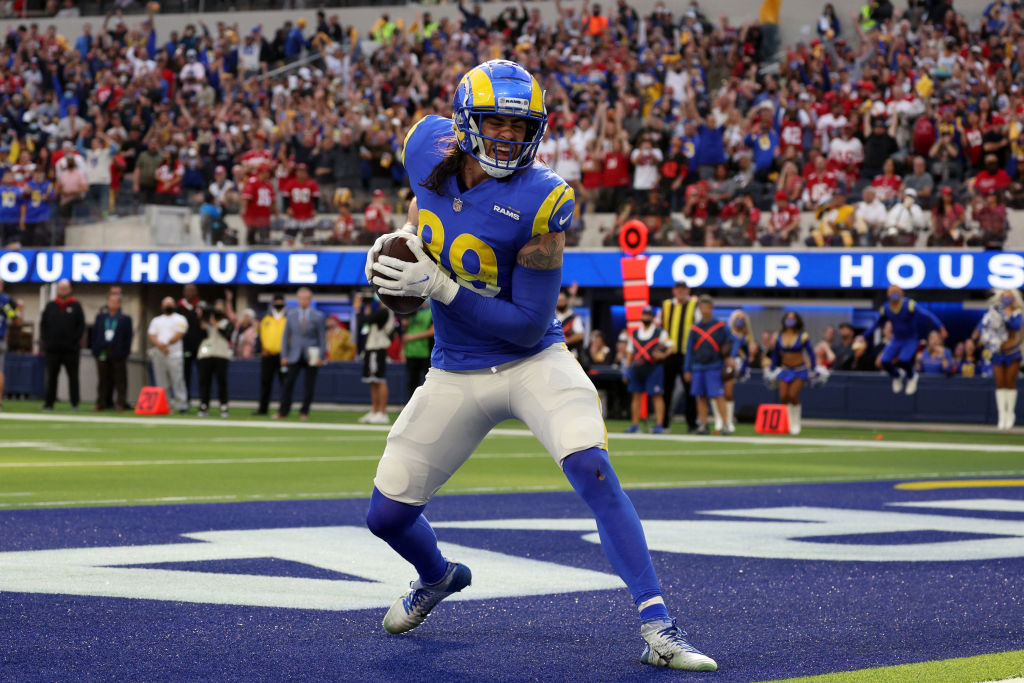 INGLEWOOD, CALIFORNIA - JANUARY 09: Tyler Higbee #89 of the Los Angeles Rams reacts after making a catch for a touchdown in the second quarter of the game against the San Francisco 49ers at SoFi Stadium on January 09, 2022 in Inglewood, California. (Photo by Harry How/Getty Images)