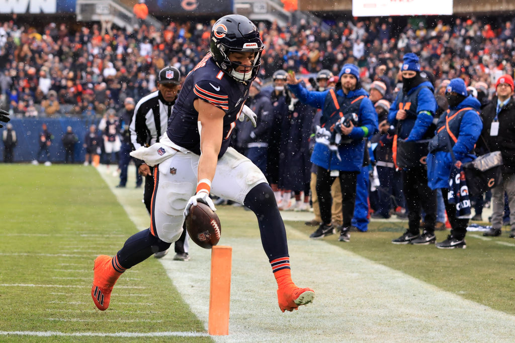 CHICAGO, ILLINOIS - DECEMBER 31: Justin Fields #1 of the Chicago Bears scores a touchdown in the game against the Atlanta Falcons at Soldier Field on December 31, 2023 in Chicago, Illinois. (Photo by Justin Casterline/Getty Images)