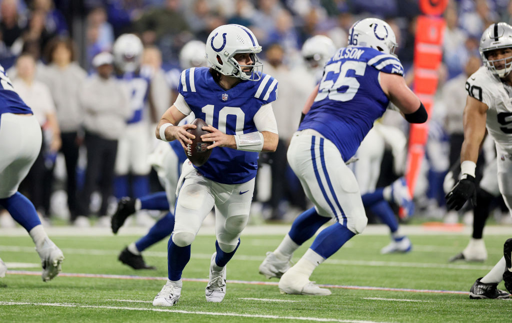 INDIANAPOLIS, INDIANA - DECEMBER 31: Gardner Minshew #10 of the Indianapolis Colts against the Las Vegas Raiders at Lucas Oil Stadium on December 31, 2023 in Indianapolis, Indiana. (Photo by Andy Lyons/Getty Images)