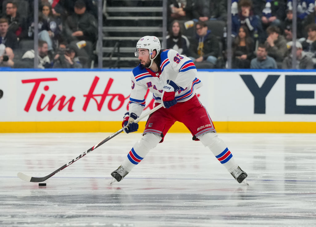 TORONTO, CANADA - MARCH 02: Mika Zibanejad #93 of the New York Rangers skates against the Toronto Maple Leafs at Scotiabank Arena on March 02, 2024 in Toronto, Ontario, Canada. (Photo by Chris Tanouye/Getty Images)