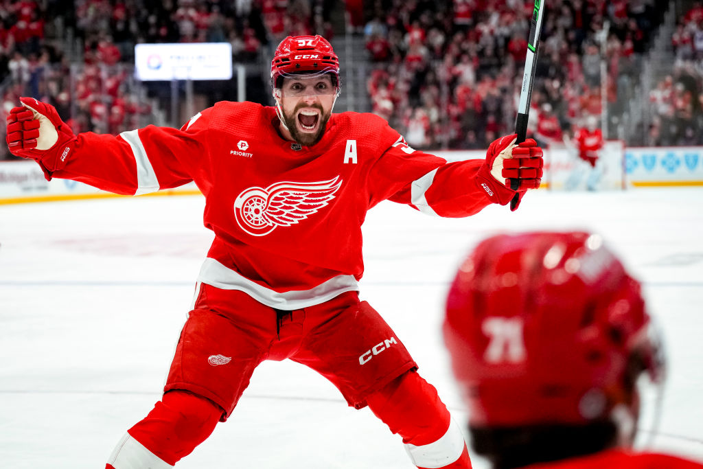 DETROIT, MICHIGAN - APRIL 05: David Perron #57 reacts after teammate Dylan Larkin #71 of the Detroit Red Wings scored a goal against the New York Rangers during the second period at Little Caesars Arena on April 05, 2024 in Detroit, Michigan. (Photo by Nic Antaya/Getty Images)